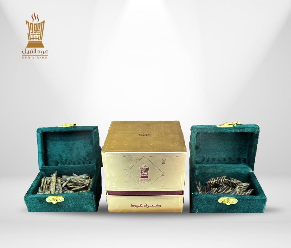 - علبة بخور كسرة عود الملكي الفاخر: استمتع بقطع البخور الملكي المنتقاة بعناية، والتي تفوح منها رائحة غنية وثابتة، تليق بالمناسبات الخاصة والاحتفالات.